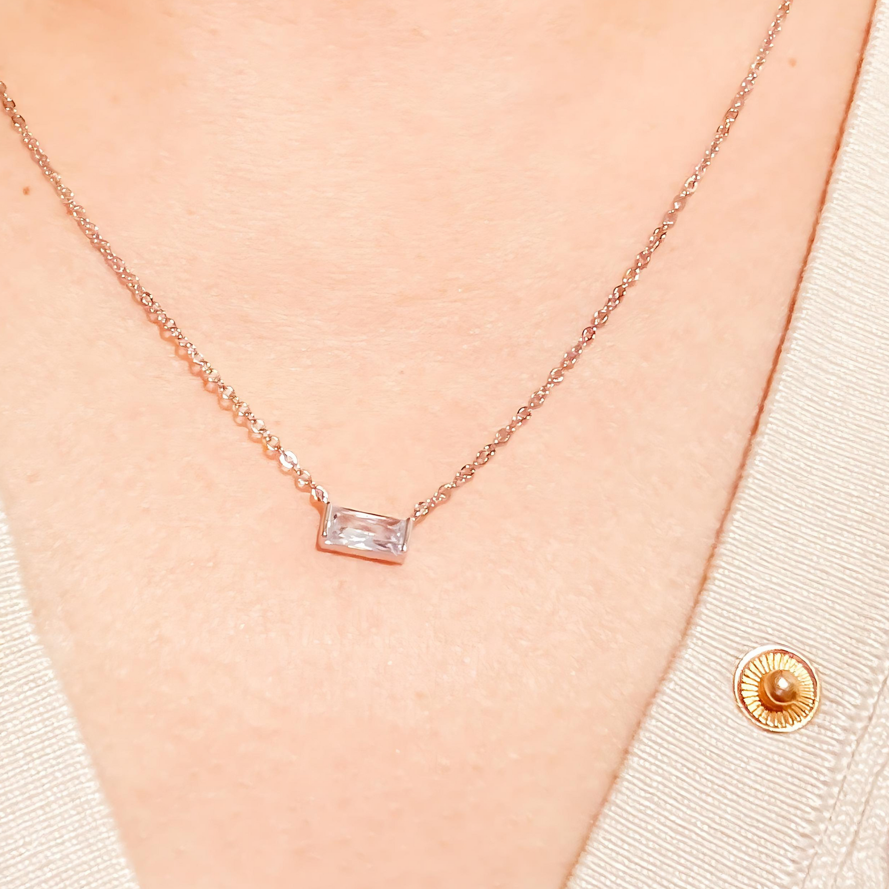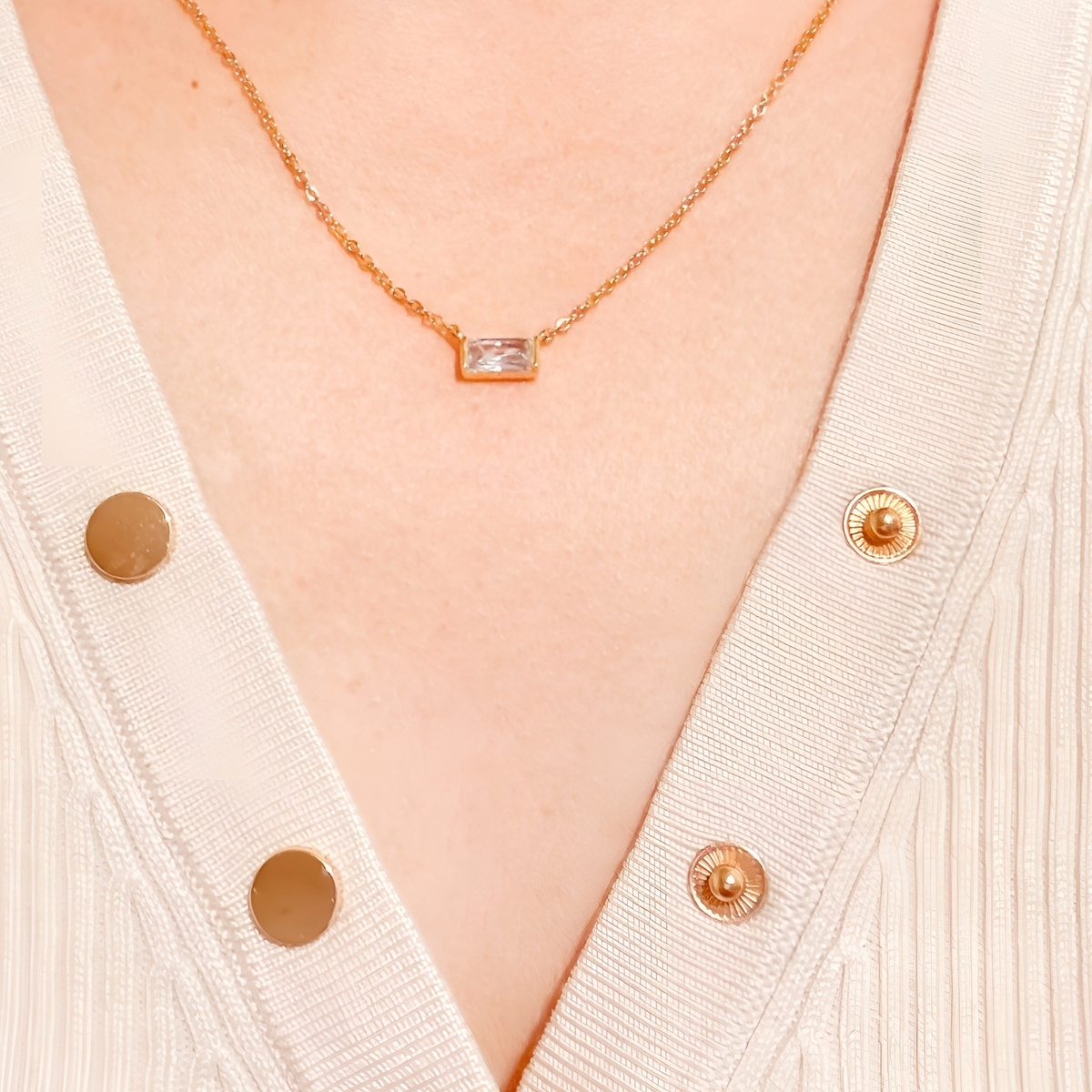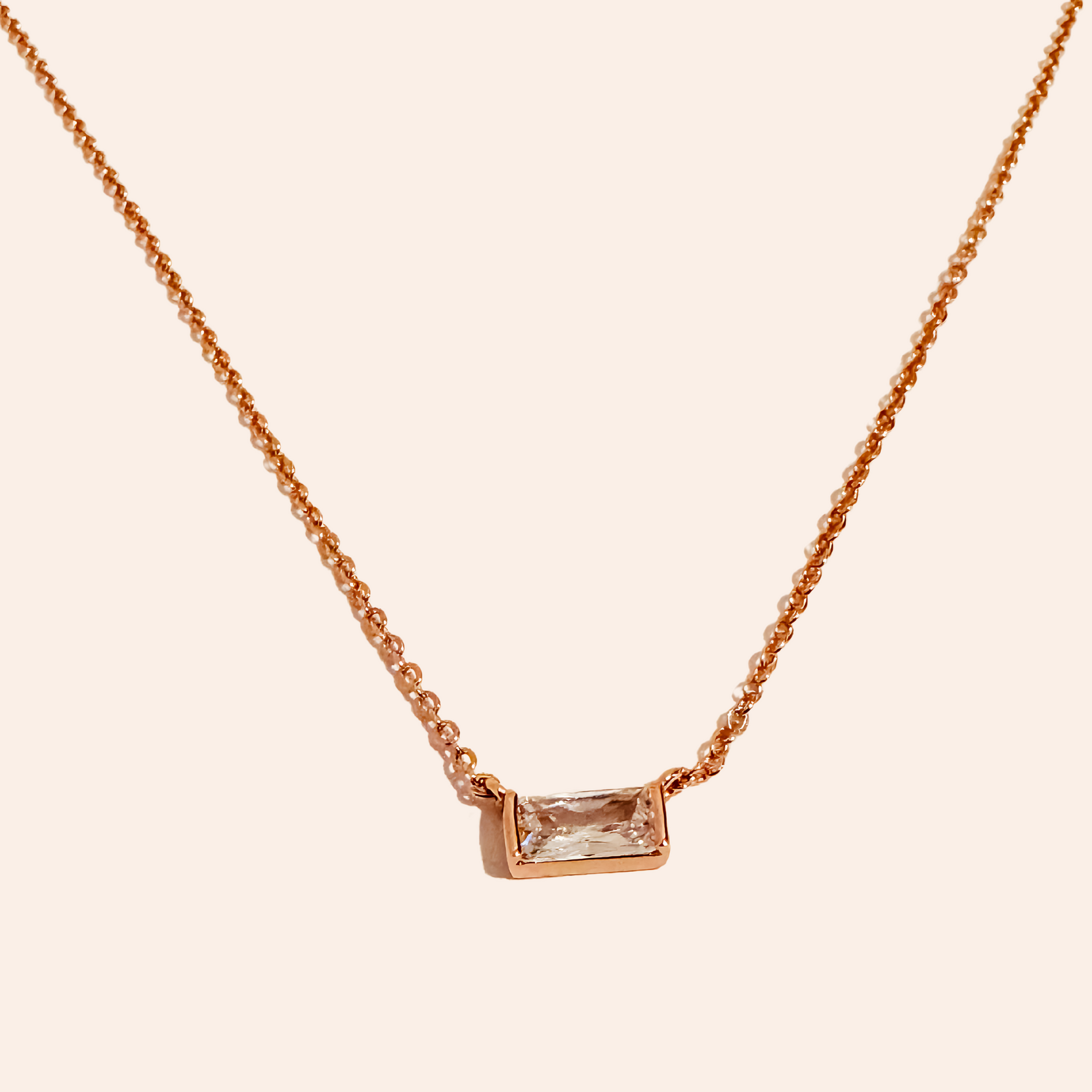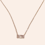 Minimal, yet magnetic, the Violet Necklace is a modern ode to quiet strength. Featuring a delicate baguette-cut crystal framed in 18k gold vermeil, its clean silhouette is softened by warmth, intention, and grace.