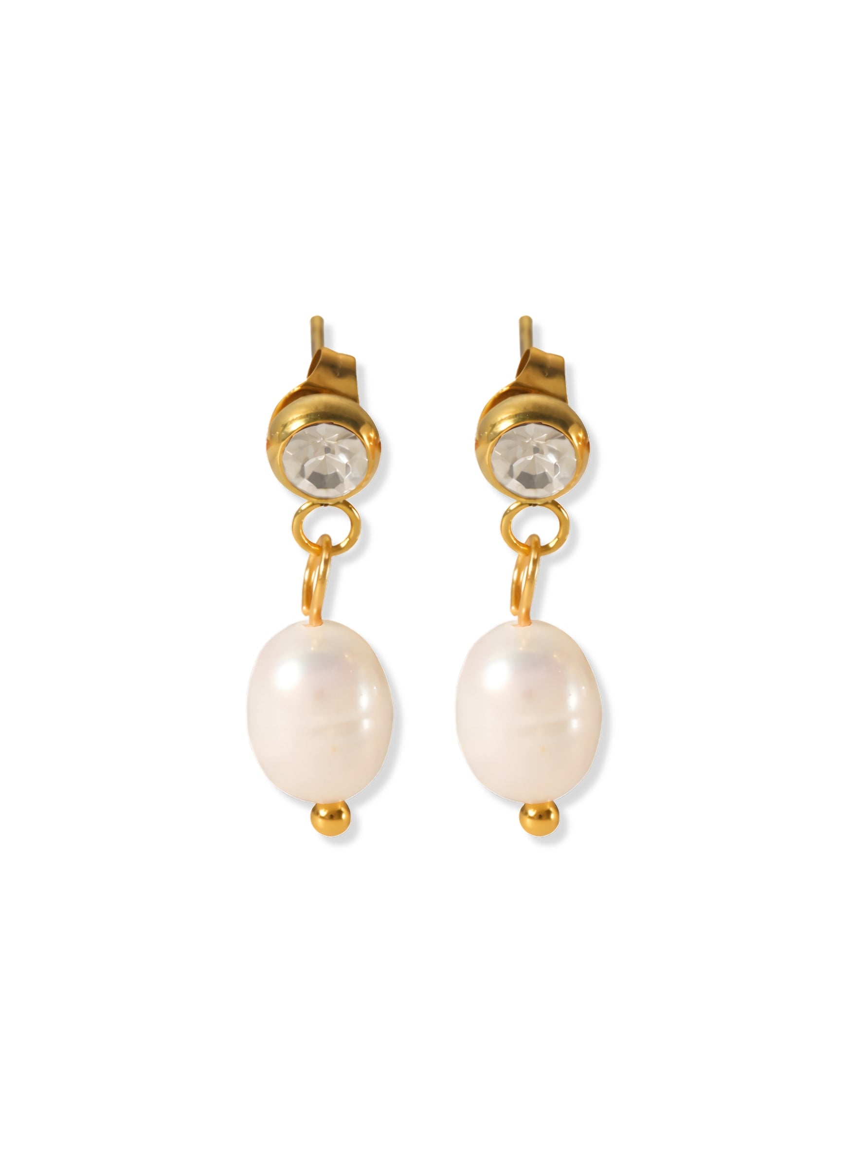 The Anchor Pearl Drop Studs feature a softly faceted crystal stud set in warm gold, acting as a subtle point of light at the ear. Suspended below, a smooth, oval pearl drop hangs delicately from a fine gold link, creating gentle movement with every step. The contrast between the crisp sparkle of the crystal and the natural glow of the pearl feels balanced, timeless, and effortlessly elegant.