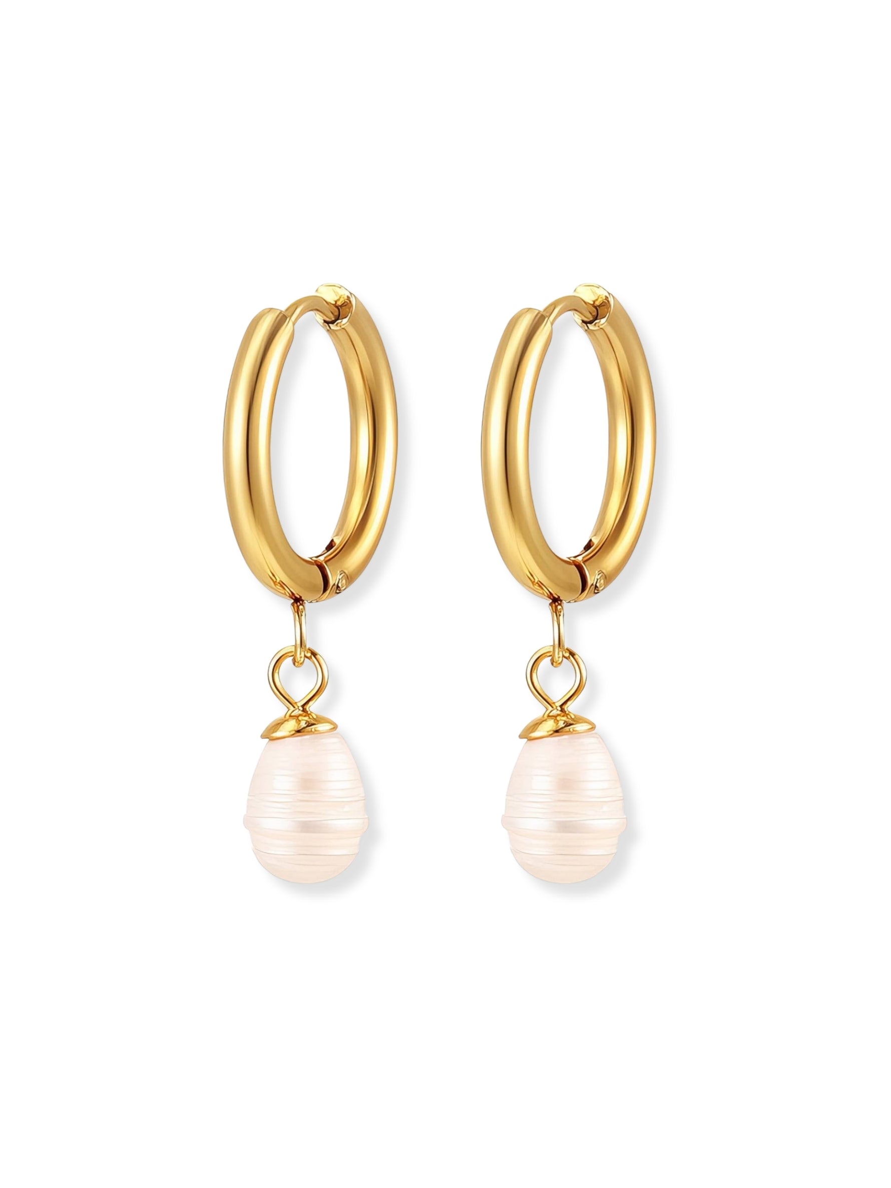 The pearl features a soft, milky glow with gentle natural texture, adding warmth and organic character to the piece. Suspended from a delicate gold link, it moves lightly as you do, catching the light in a way that feels natural rather than polished. The contrast between the clean gold huggie and the softness of the pearl creates a timeless silhouette that’s easy to wear, day after day.