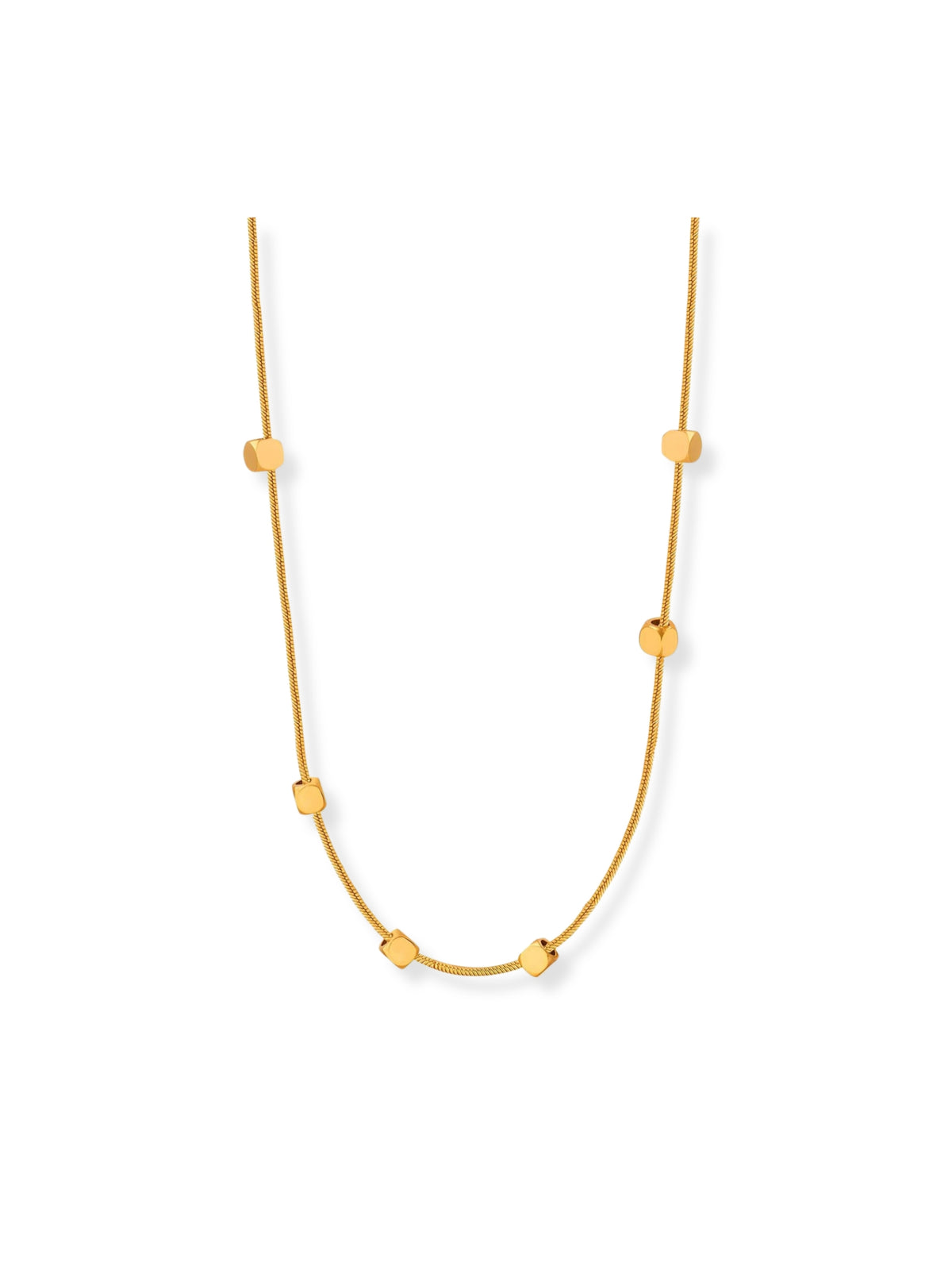 The Hearth Square Chain Necklace features a fluid gold chain accented with small, polished square stations spaced thoughtfully along its length. Each square bead acts like a quiet marker, subtle points of reflection that catch the light gently as you move. The geometry brings balance and intention, while the smooth, rounded edges keep the feel warm and wearable.